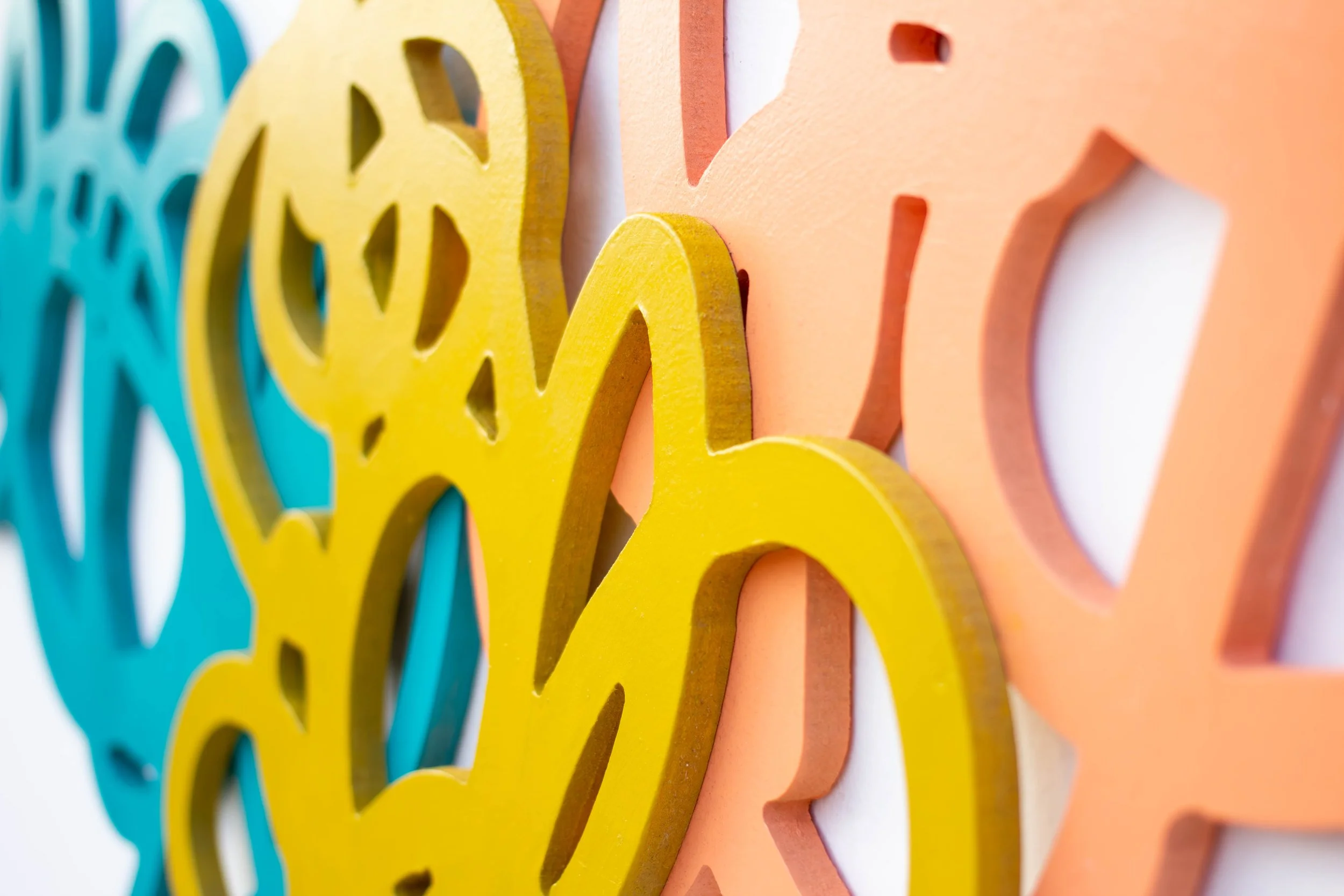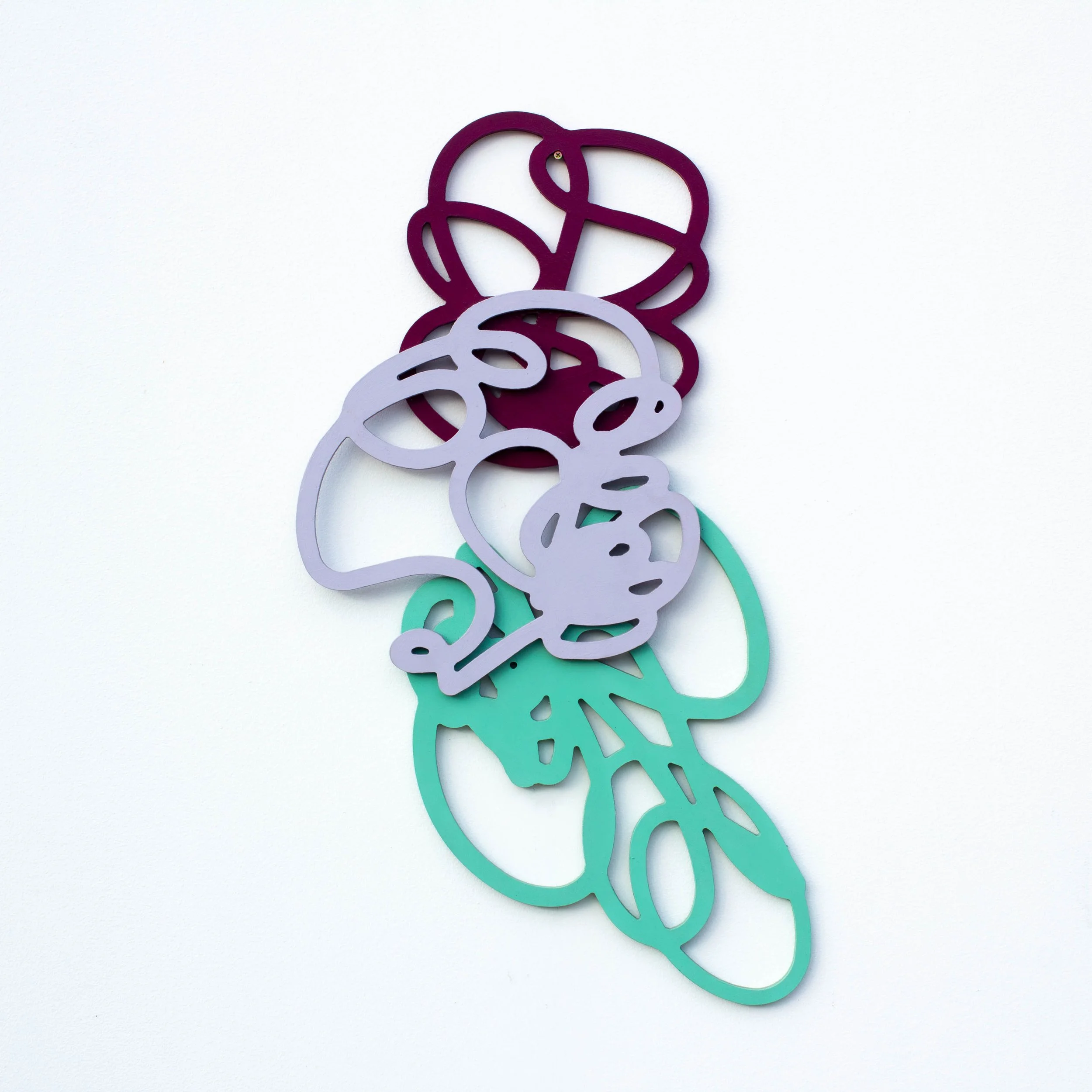 These are part of a sculptural series created by Branger using CNC-cut designs. She layered the forms to create these wall-mounted pieces, otherwise known as three-dimensional paintings.